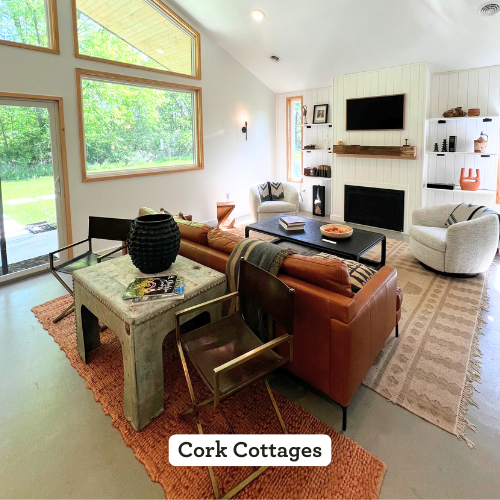 Modern cottages surrounded by peaceful scenery, a pond, and open sky — each with two bedrooms, two full baths, and a cozy living space. The Cork Cottages offers the perfect mix of privacy and proximity to Grand River Valley wineries.