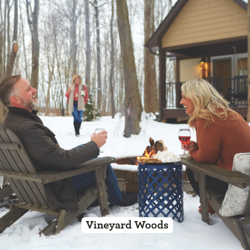 Tucked among rolling vineyards in the heart of the Grand River Valley, Vineyard Woods offers modern-rustic luxury surrounded by nature. Choose from the elegant Vineyard Villa or cozy cottages — all with upscale finishes, fireplaces, and woodland or vineyard views. It feels secluded, yet sits just minutes from dozens of wineries.