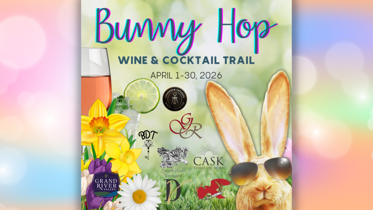 April 1-30, 2026 Noon-5PM. Hop from place to place, sampling wines paired with Spring appetizers & desserts! $8 per person at each location. Refresh your palate for Spring with seasonal flavors paired with the perfect wines. Choose the perfect wines to pair with your Easter dinner! Visit Grand River Cellars, Cask 307, Debonné Vineyards, NEW! Corkscrew Taphouse, South River Vineyards, Red Eagle Distillery and Black Door Tavern to enjoy a featured Spring or Easter-themed appetizer and two wine samples (mini-cocktail at Red Eagle & Black Door). Try fun, featured, seasonal cocktails at an additional cost. Pick an egg at each location for 1-3 raffle tickets you can fill out for a chance to win the raffle basket at that location! Pick up a trail card at any location and complete the trail by 5PM April 30th for a chance to win an Overnight Grand River Valley Getaway Package that includes an overnight stay at a Grand River Valley hotel and a gift certificate package.