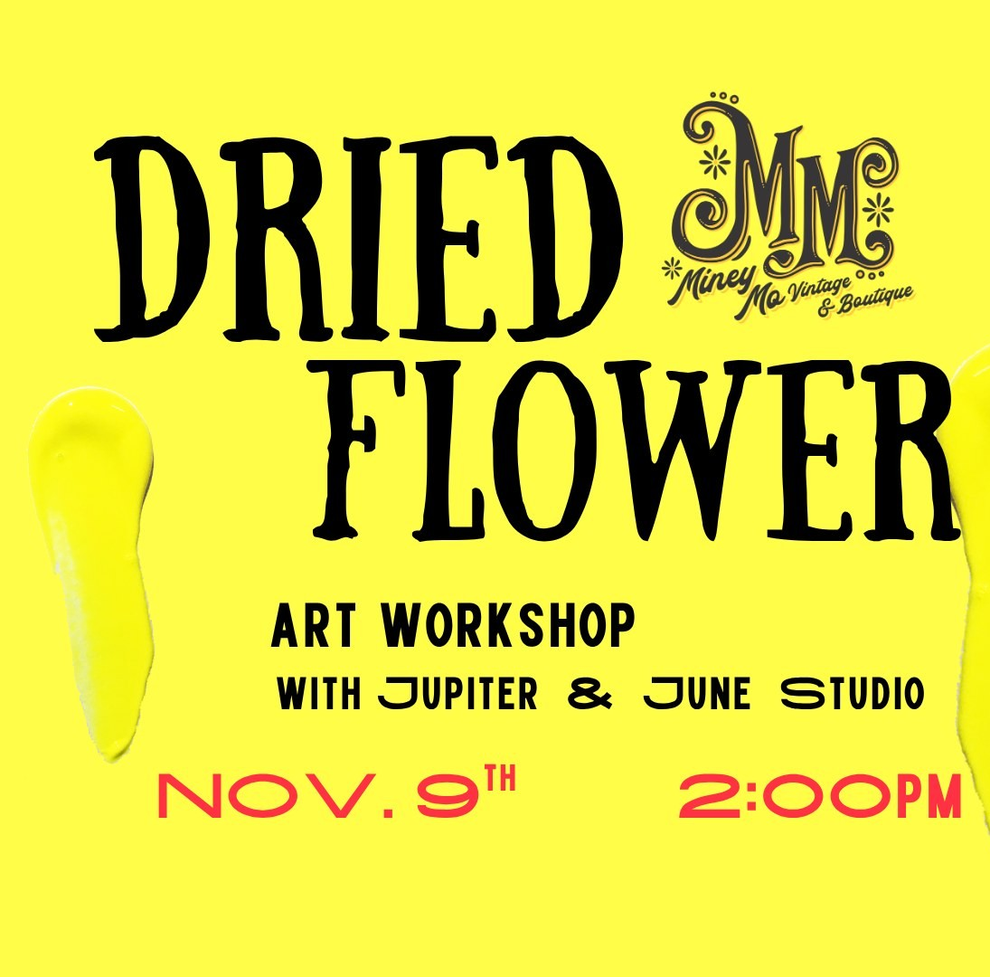 Class includes all the dried flowers, greenery, templates, gold 8.5×6.5 inch floating frame to display your artwork in and take home & materals. Also guidance and assistance by Jupiter & June Studio owner Melissa Walling. Also included in the class is a complimentary sparkling wine toast, coffee and water. We are a DORA participant and you may bring drinks in for the class from participating businesses only.