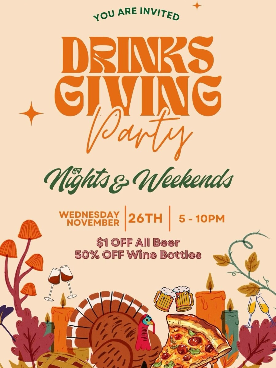 Dine and Drink Drinksgiving Party schedule Details Date: November 26 Time: 5:00 pm - 10:00 pm Event Category: Dine and Drink location_on Nights & Weekends 1035 Bridge St. Ashtabula, OH 44004 United States + Google Map phone_iphone (440) 661-4061 This event has passed.
