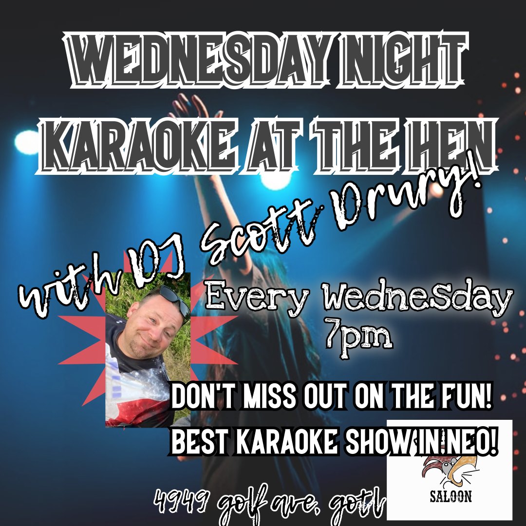 Live Music Karaoke w/ DJ Scott Drury schedule Details Date: March 25 Time: 7:00 pm - 10:00 pm Series: Karaoke w/ DJ Scott Drury Event Category: Live Music location_on Crowing Hen Saloon 4949 Golf Ave. Geneva on the Lake, OH 44041 United States + Google Map phone_iphone (440) 361-3132 All Dates for this Event