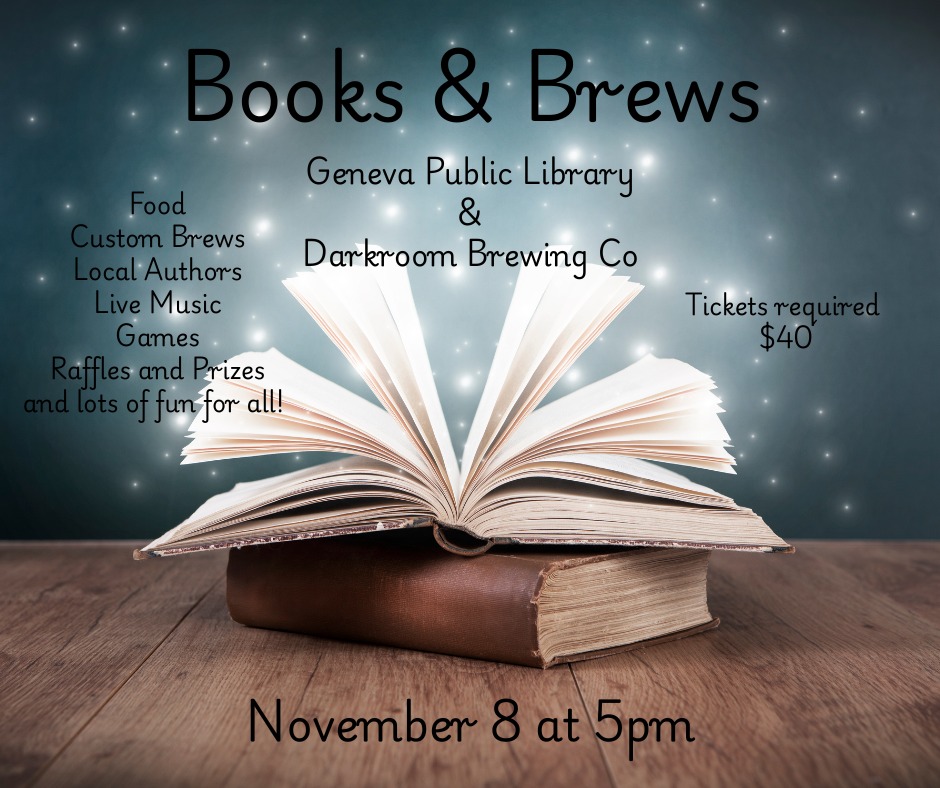 Geneva Public Library is hosting Books & Brews with Darkroom Brewing Co. There will be food, custom brews, local authors, live music, games, raffles and prizes, and lots of fun for all! Tickets are required and may be purchased at Darkroom for $40.