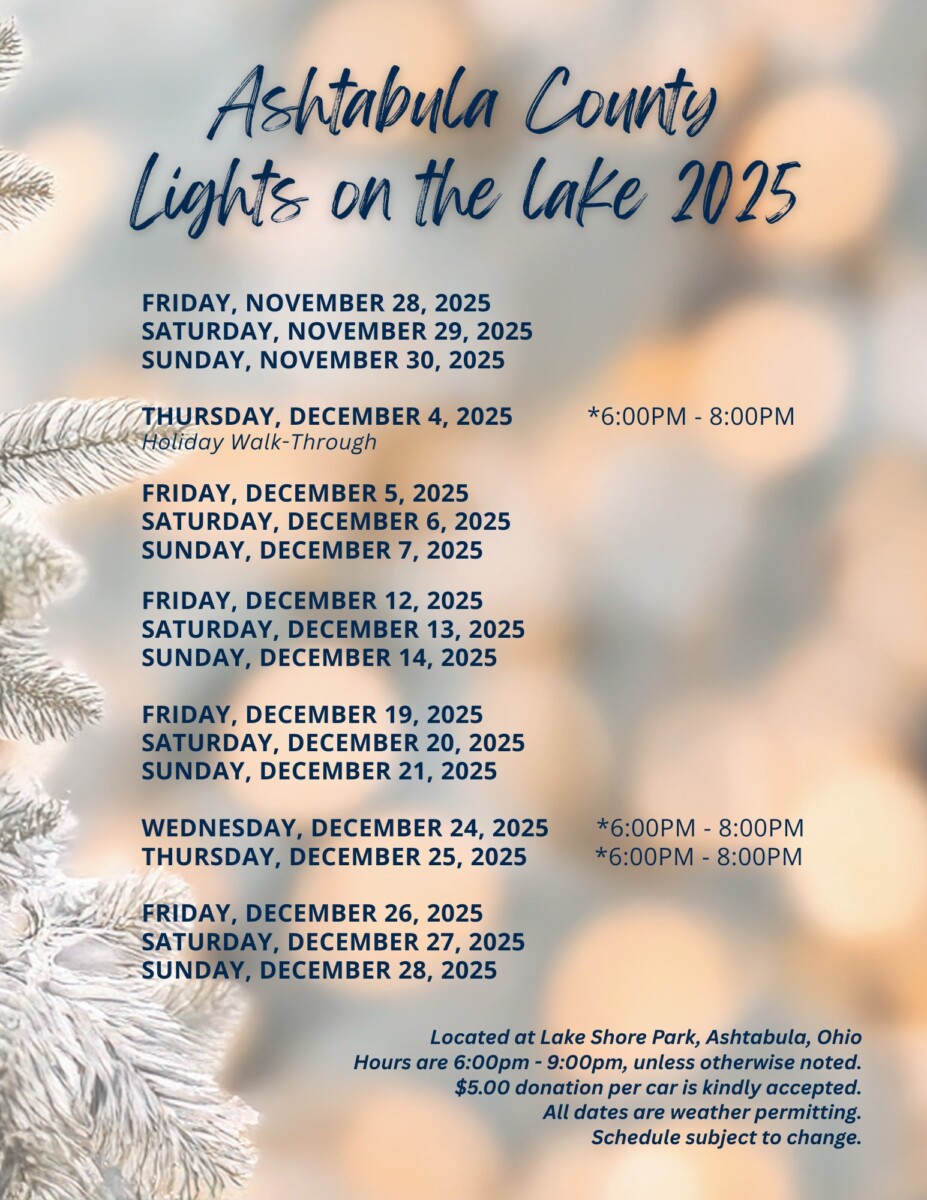 Visit Lakeshore Park in Ashtabula any Friday, Saturday, or Sunday between November 28 and December 28 from 6-9 p.m., + Christmas Eve & Christmas Day during special hours from 6-8 […]